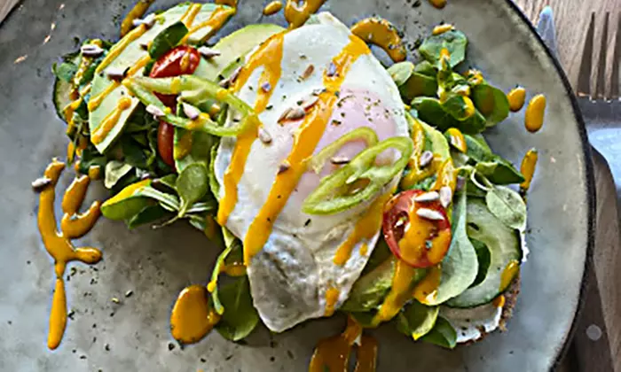 - Avocado : 3 eggs stuffed with avocado, served with salad