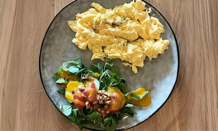 - Veggie : 3 eggs with mushrooms and bell peppers, served with salad